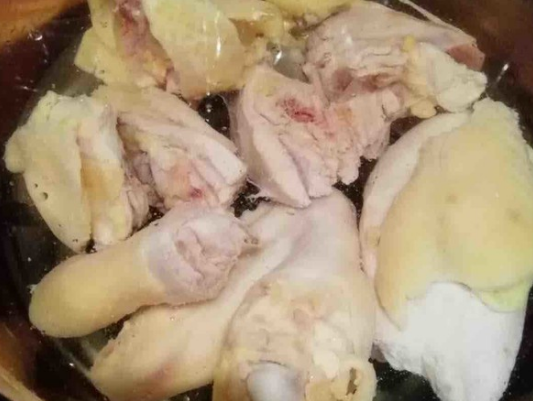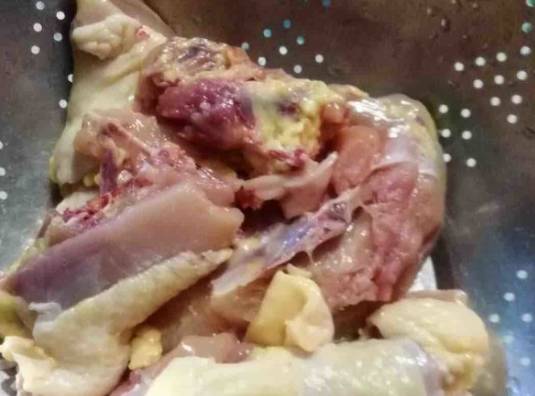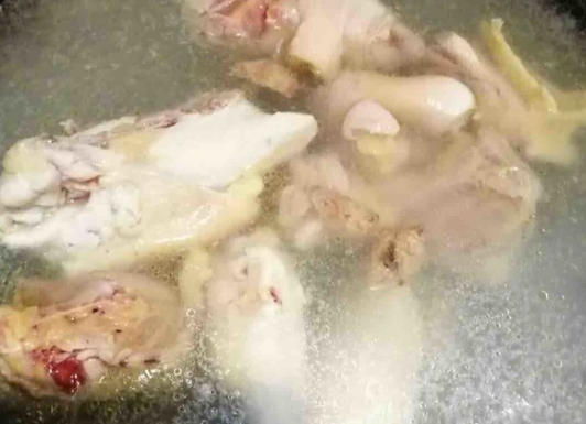 然后,冷水下锅,将鸡肉掉水,煮熟后捞出来,清洗干净。