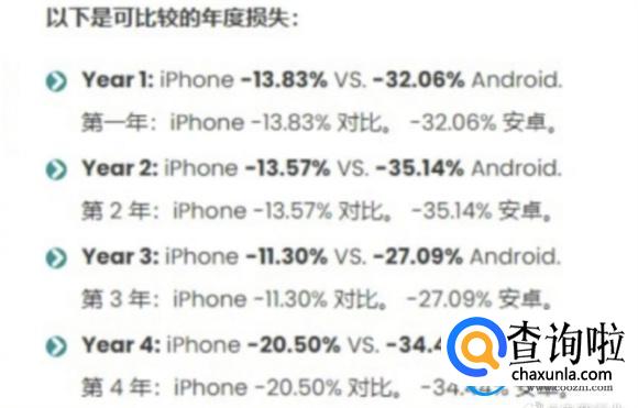 根据报告中显示,在第一年的时候,苹果手机的折旧率仅为13.83%,安卓手机在第一年的折旧率高达32.06%,在第二年的时候,苹果手机的折旧率略微出现下滑,下降到13.57%,反观安卓手机的折旧率呈现接连攀升的局面,达到了35.14%,第三年苹果手机的折旧率下降到11.3%,安卓手机的折旧率在这个时期迎来下降,到达27.09%。