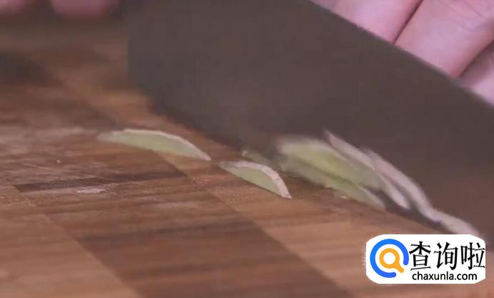 然后切3片生姜,再将生姜切成丝,再切碎。