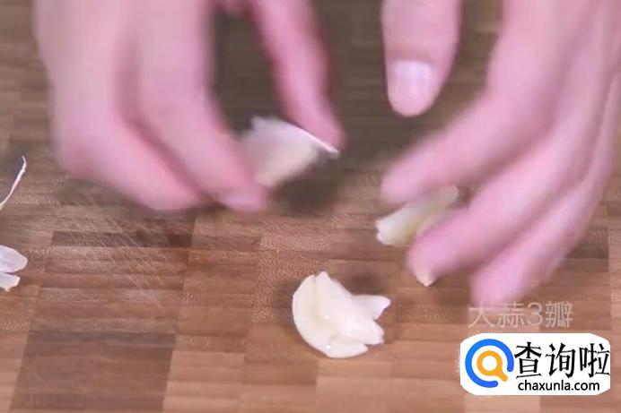 然后将大蒜先拍扁再剥皮。