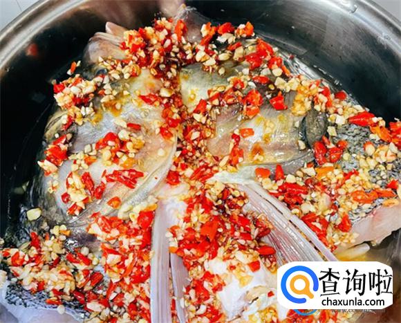 5. 将剁椒均匀地铺到鱼头上面,放入蒸锅中,大火蒸上10-12分钟,等到鱼头熟透。起锅后,撒上葱花,淋上滚烫的热油,再次激发出葱花和剁椒的香辣味。