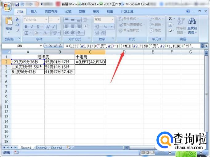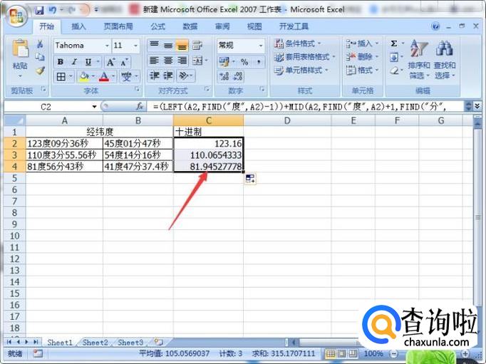 我们在C2单元格输入公式【=(LEFT(A2,FIND("度",A2)-1))+MID(A2,FIND("度",A2)+1,FIND("分",A2)-FIND("度",A2)-1)/60+MID(A2,FIND("分",A2)+1,FIND("秒",A2)-FIND("分",A2)-1)/3600】