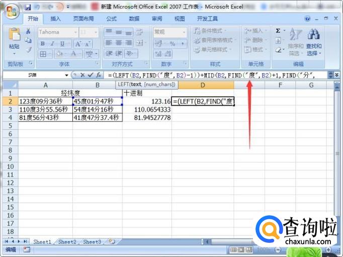 同理,我们在D2单元格输入公式【=(LEFT(B2,FIND("度",B2)-1))+MID(B2,FIND("度",B2)+1,FIND("分",B2)-FIND("度",B2)-1)/60+MID(B2,FIND("分",B2)+1,FIND("秒",B2)-FIND("分",B2)-1)/3600】