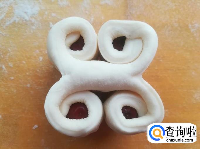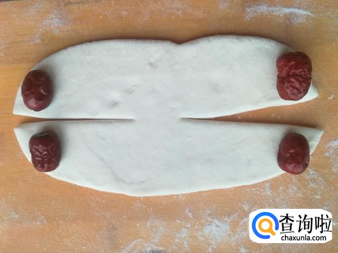 再把1个剂子分成相等的两个小剂子,擀成薄的长条,两头摆上红枣,向内卷成如图的样子,制成枣卷馍生坯。