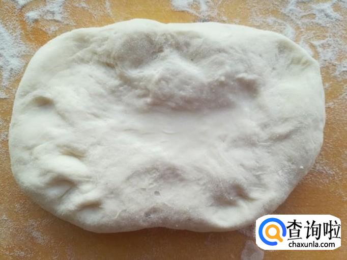面团发酵好后,把面团放案板上,撒5克小苏打粉和面团揉在一起,揉匀揉透。