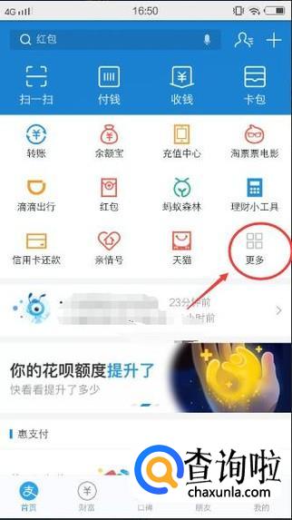 首先打开支付宝,点击【更多】按钮,如下图所示: