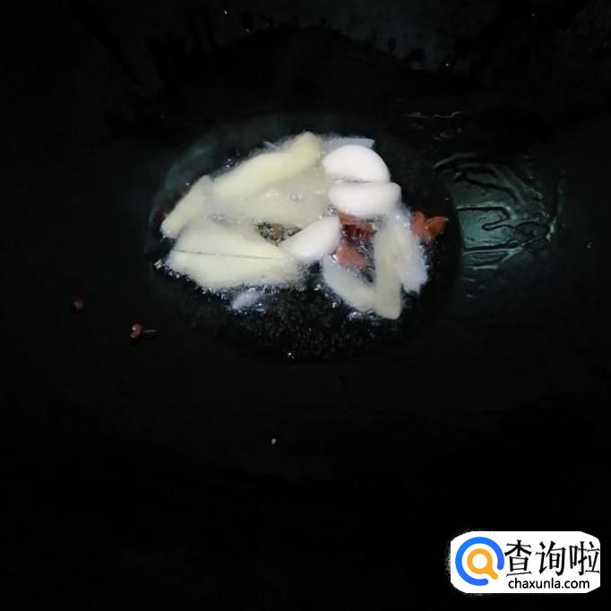 锅烧七成热放适量花生油,先下配料小火煸出香味。