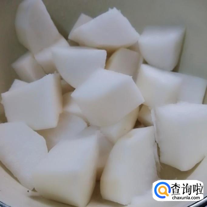 再把白萝卜洗干净打皮,切成块,可以切大一点,因为萝卜比牛肉肯定易熟一点。