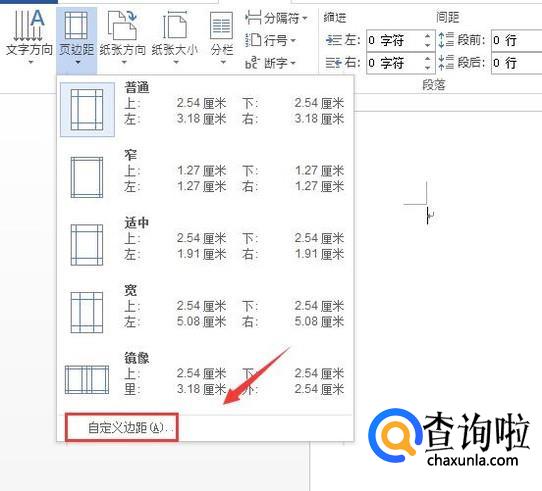 点击页边距选项在其子级菜单里找到自定义页边距选项,如图所示: