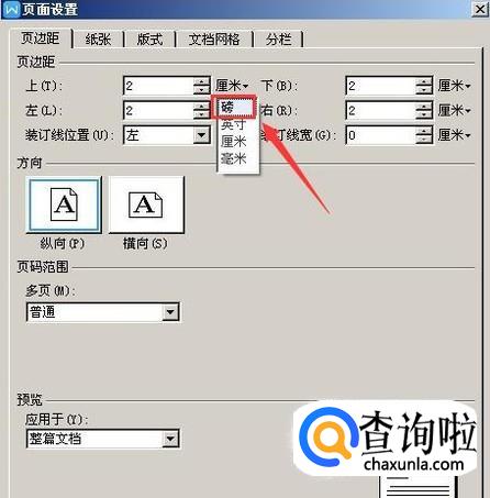 点击自定义页边距选项在弹出的对话框内找到单位,在这里我们就可以设置为磅和英寸了,如图所示:
