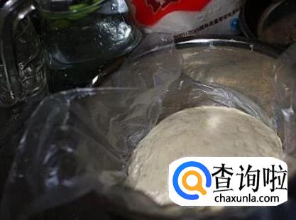 拿个盆子,倒入高筋面粉加入适量水和盐,跟做包子一样和面粉,和成一个面团,用保鲜膜包起来发酵半小时左右。