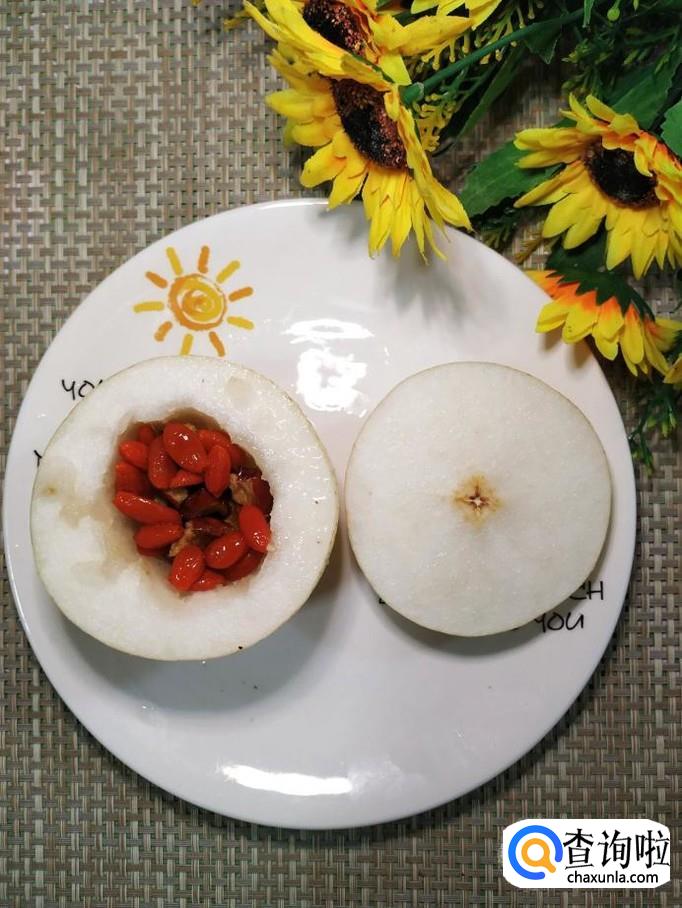 提前用清水泡发适量枸杞子,然后将枸杞子放入雪梨中。