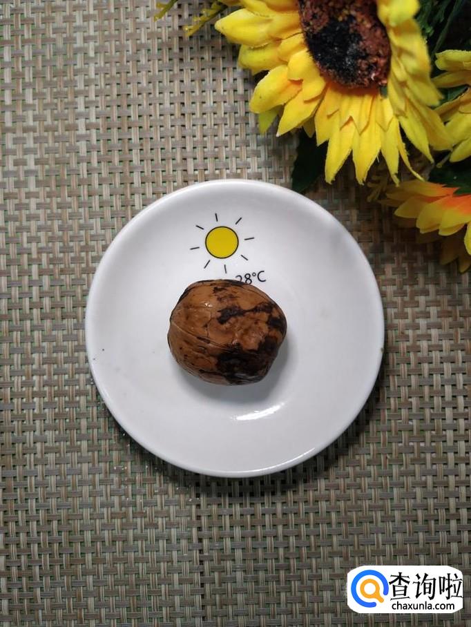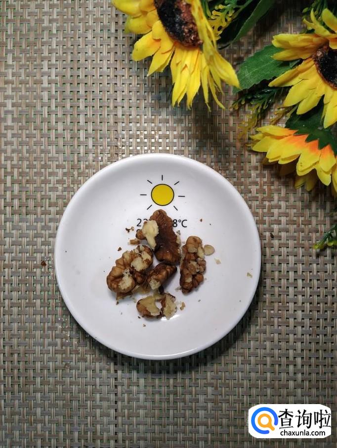准备一个核桃,用钳子捏出果仁,切碎后,放入雪梨中,核桃中含有治咳嗽的成分,可以起到补益的作用。