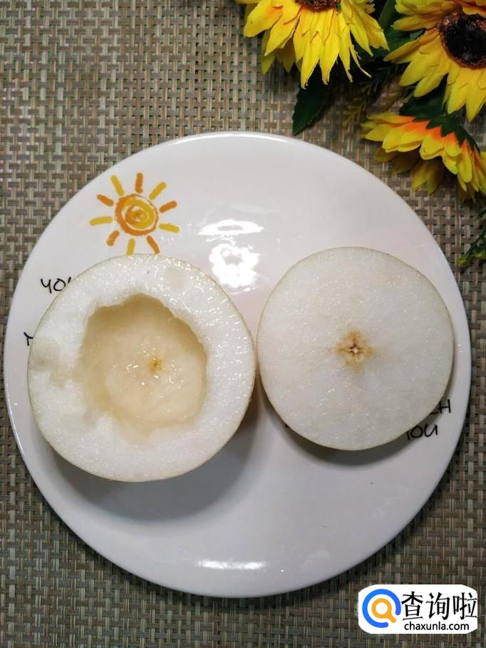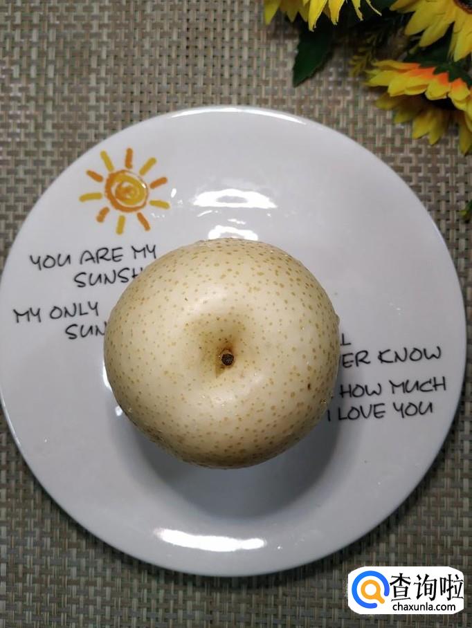 准备一个雪梨,洗净后,在1/3处,用刀切开,然后用小勺小心的挖出一个洞备用。