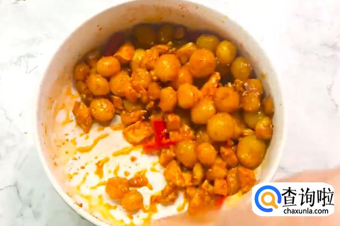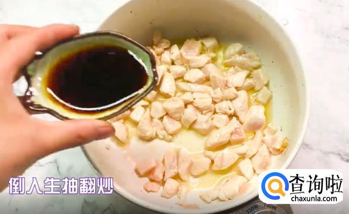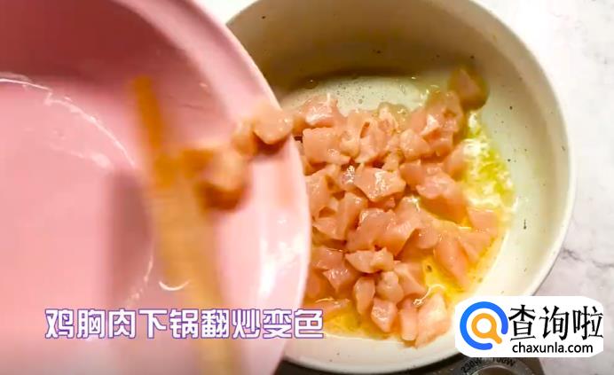 捞出小土豆后,将腌制好的鸡胸肉放进去翻炒,直到肉泛白。