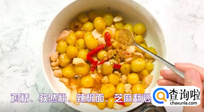 翻炒一会后倒入小土豆,再加入盐、胡椒粉、干辣椒、鸡精、孜然粉、辣椒面和芝麻,然后继续翻炒。