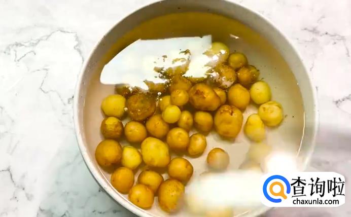 小土豆煮熟之后将其捞出,热好油,将小土豆放进去煎至呈金黄色为止。