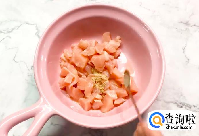 接着,将准备好的鸡胸肉切成块,然后再加入料酒和胡椒粉,搅拌均匀后,放在一旁腌制10分钟。
