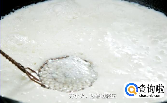 最后压制烧煮,开小火,边煮边轻压,让豆花能够更紧密的结合。