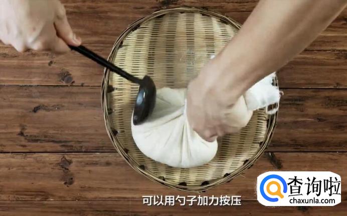 将煮好的豆浆倒入纱布,旋转拧紧,可以用勺子加力按压。让豆浆流入盆中,豆渣留在纱布里。