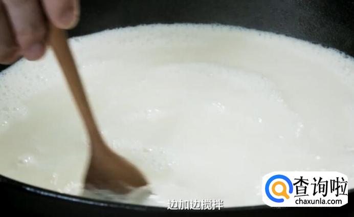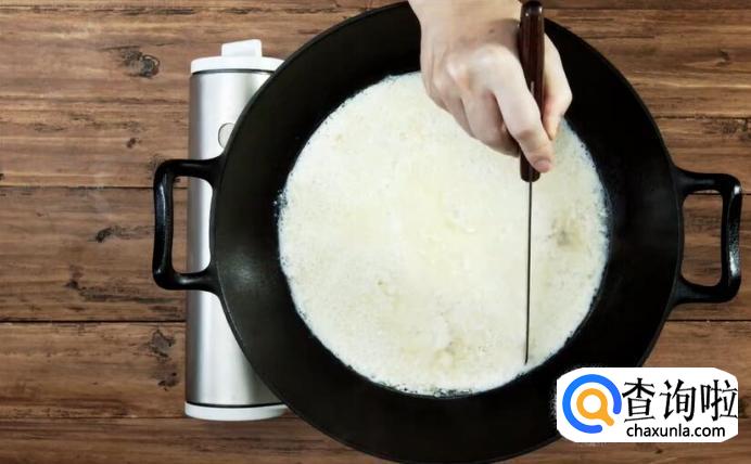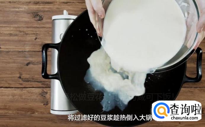 将过滤好的豆浆趁热倒入大锅中,等温度降到80-90度左右,就可以开始点卤了。
