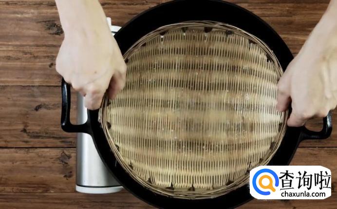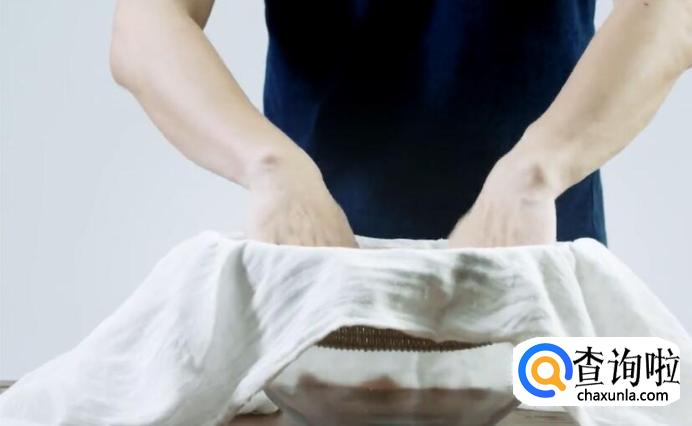 接下来过滤,取一个大盆,放上筲箕,筲箕上再铺一层纱布。