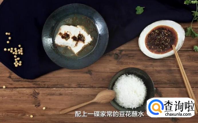 将烧好的豆花盛出,配上一碟家常的豆花蘸水,再配上一碗上好的白米饭,鲜辣可口,可以激发食欲。