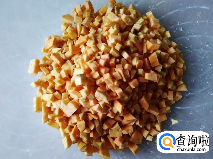 切成很细的小丁。【小丁要切细点,煎的时候才容易熟】