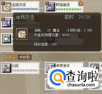 商人的第一个主动技能叫金钱攻击,一听就满是铜臭味,作为基础技,必须加满不然打怪就跟爬一样;