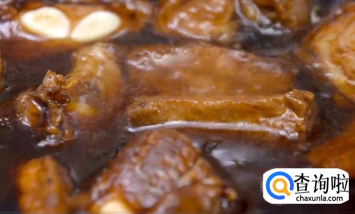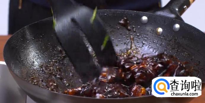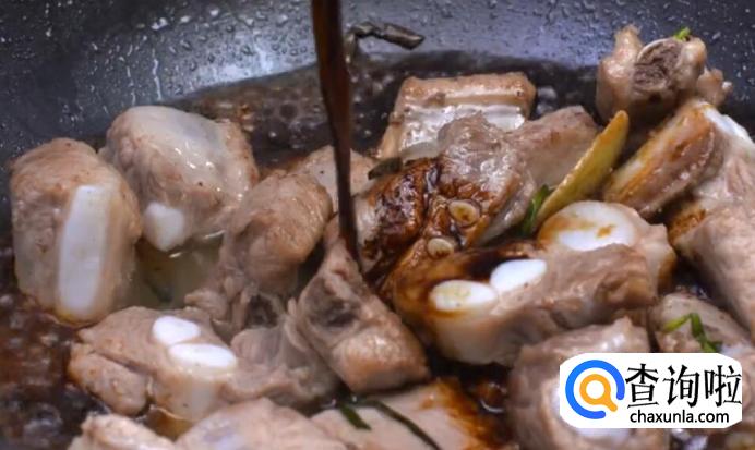 倒入排骨,小火煸炒至金黄色。