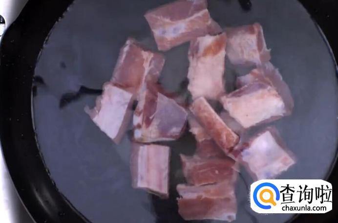 放一锅冷水,开火。倒入肋排骨戳水。