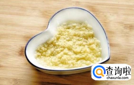 将大蒜剥皮后,去根,洗净,放在碗里,加少量盐,将蒜捣烂成泥状。