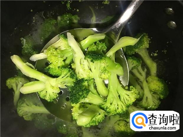 锅里提前烧开一锅水,水开后,放入西兰花烫,加入少许盐,大概烫3分钟,捞起来沥干水分备用。