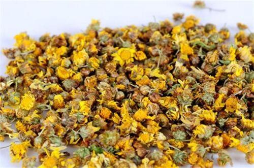 野菊花为菊科植物野菊的头状花序,成分为野菊花内酯、野菊花醇、黄酮苷等,性微寒,可治疗冠心病、高血压、风热感冒、肺炎、鼻炎、支气管炎、咽喉肿痛、目赤模糊、淋巴腺炎、痈疖疔毒、湿疹、皮肤瘙痒、口疮、丹毒等症。