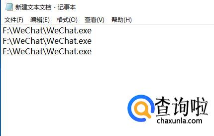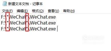 打开【文本文档】,将刚才复制的【目标】内容“F:WeChatWeChat.exe”粘贴进去,并在第一个和第二处添加英文状态的双引号,同时想要打开几个微信,就复制几行,这里以打开3个微信为例。