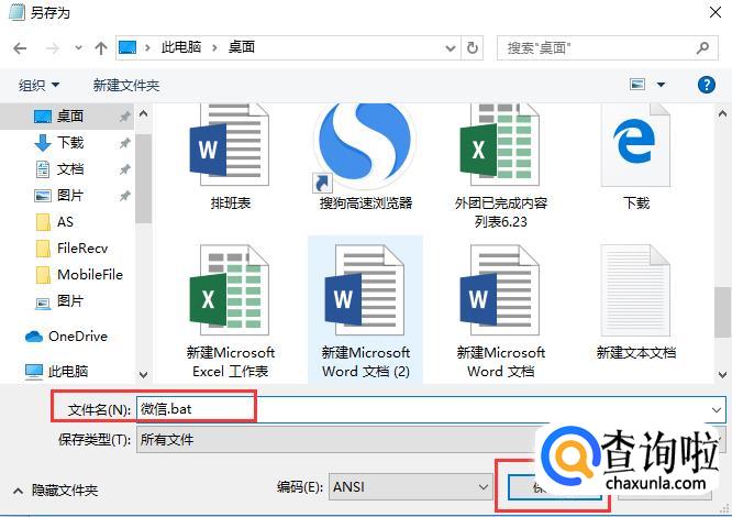设置文件名【微信.bat】,需要注意文件名的后缀必须要是【.bat】,不然文件无法自动运行。