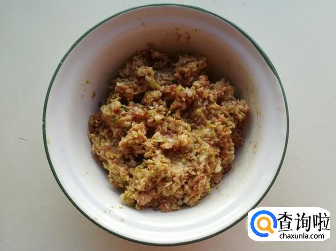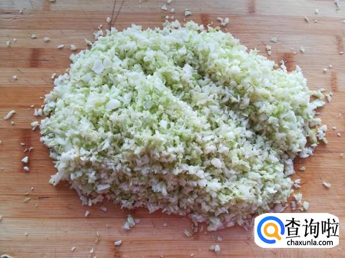 把牛心菜洗净,剁成碎粒,攥去水份,放肉泥盆里,搅拌均匀,制成饺子馅。