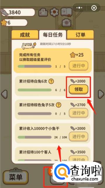 客人会用小鱼干作为用餐的费用,记得点击小鱼干进行收获哦。注意:有的客人在用餐结束以后还会给小费(小鱼干),想要得到小鱼干需要分享给微信好友。