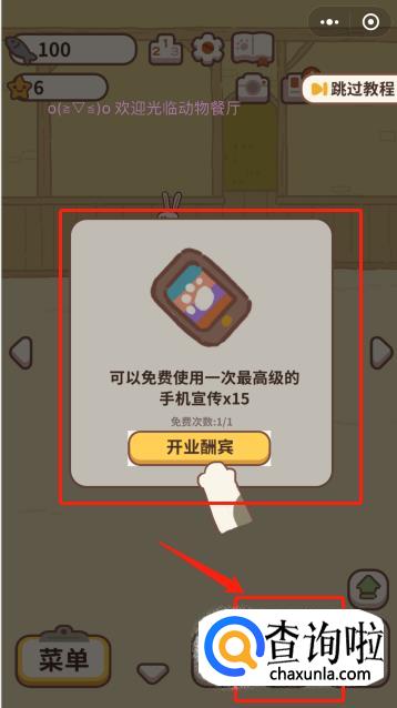 为了增加餐厅的营业,可以点击右下角的【宣传】,然后点击【开业酬宾】来招揽客人。