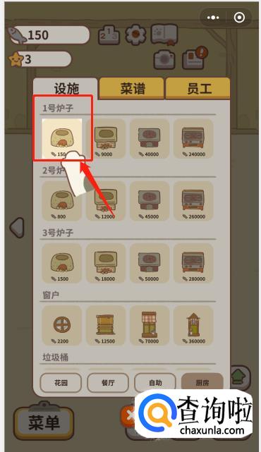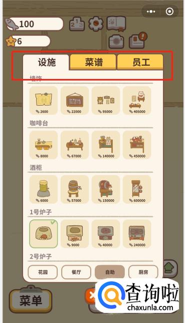 如果是第一次进入游戏,后厨是没有设备可以使用的。点击【菜单】,购买需要的设施,比如“炉子”。