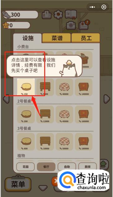 餐厅开始营业了。需要点击右下角的菜单,购买需要用到的设施。比如:小灶台、餐桌。注意:购买设施时需要花费小鱼干。