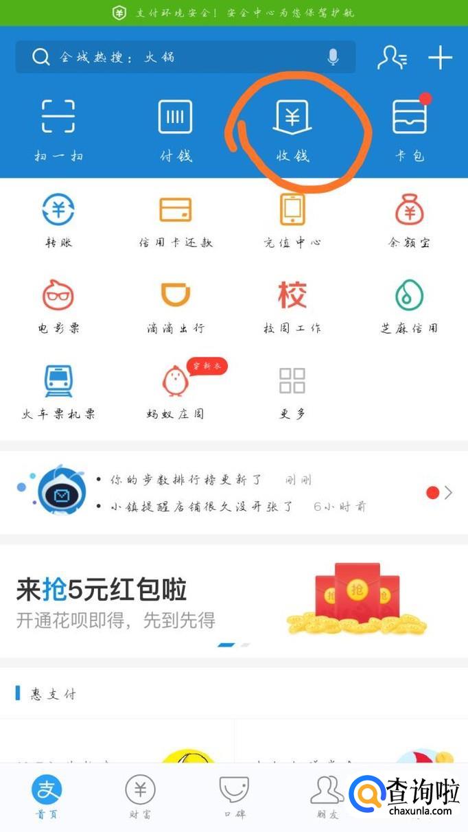 打开支付宝的页面首页,然后找到“收钱”的选项点击进入