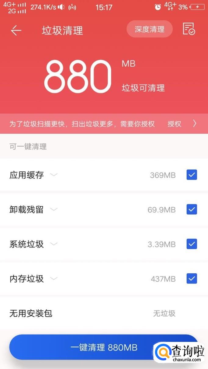 或者还可以在首页点击垃圾清理,将系统扫描出的垃圾点击清除,就可以加速手机了。