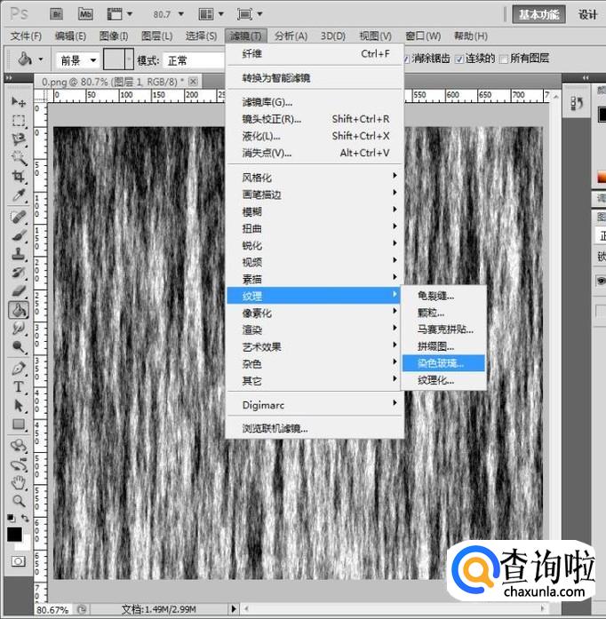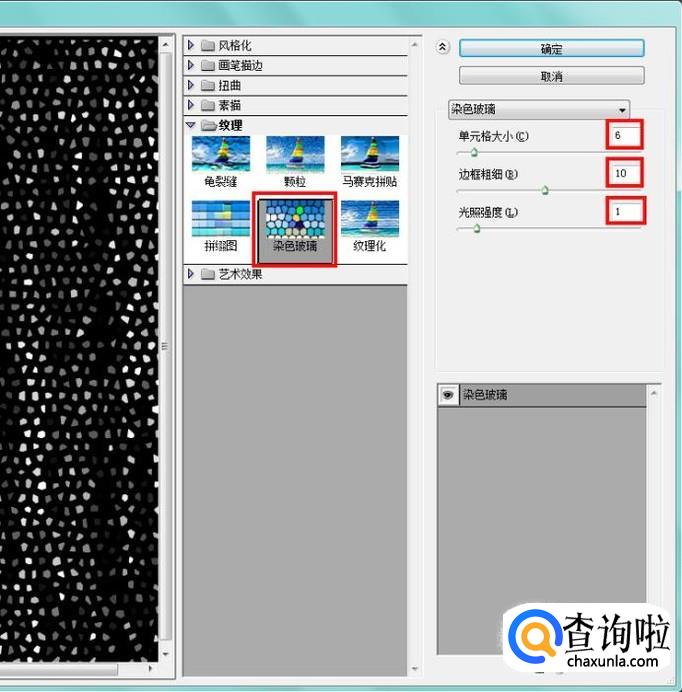 打开滤镜菜单,找到纹理->染色玻璃,参数如图设置;