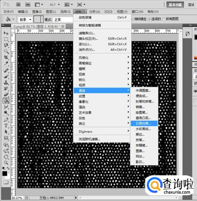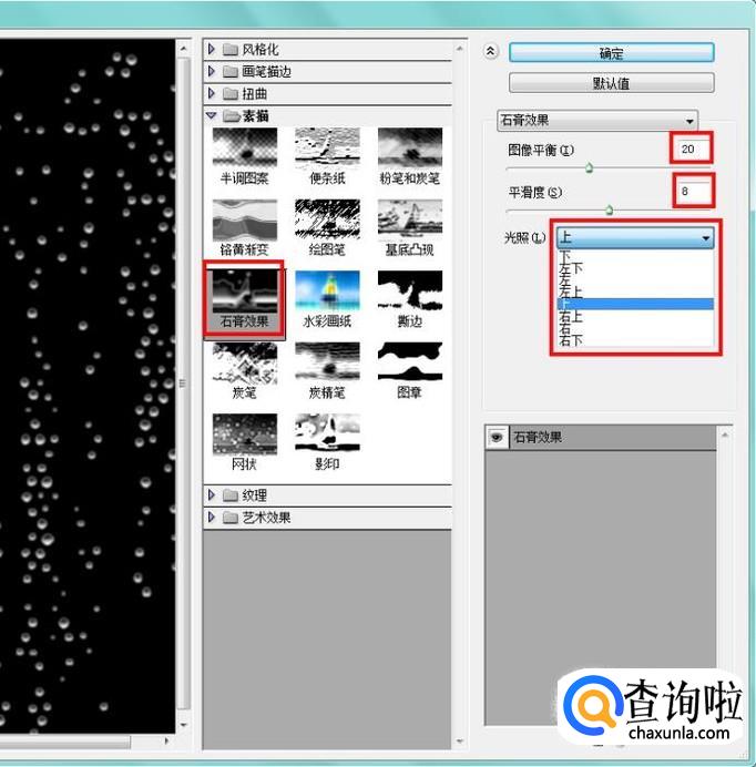 打开滤镜菜单,找到素描->石膏效果,参数如图设置,光照可根据图片中的光源调整;
