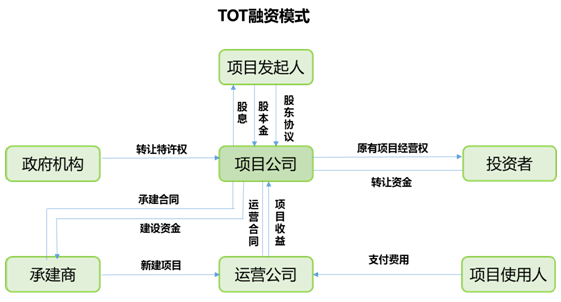 TOT模式是国际上较为流行的一种项目融资方式,通常是指政府部门或国有企业将建设好的项目的一定期限的产权或经营权,有偿转让给投资人,由其进行运营管理;投资人在约定的期限内通过经营收回全部投资并得到合理的回报,双方合约期满之后,投资人再将该项目交还政府部门或原企业的一种融资方式。