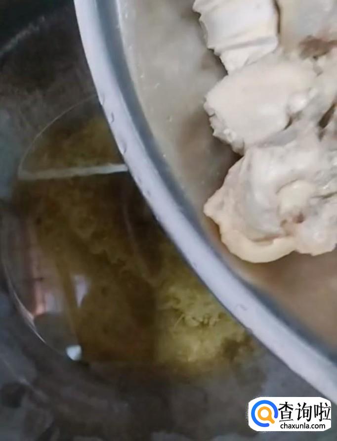 接着我们在锅中烧油,油热下入鸡块翻炒一下,翻炒至鸡块变色