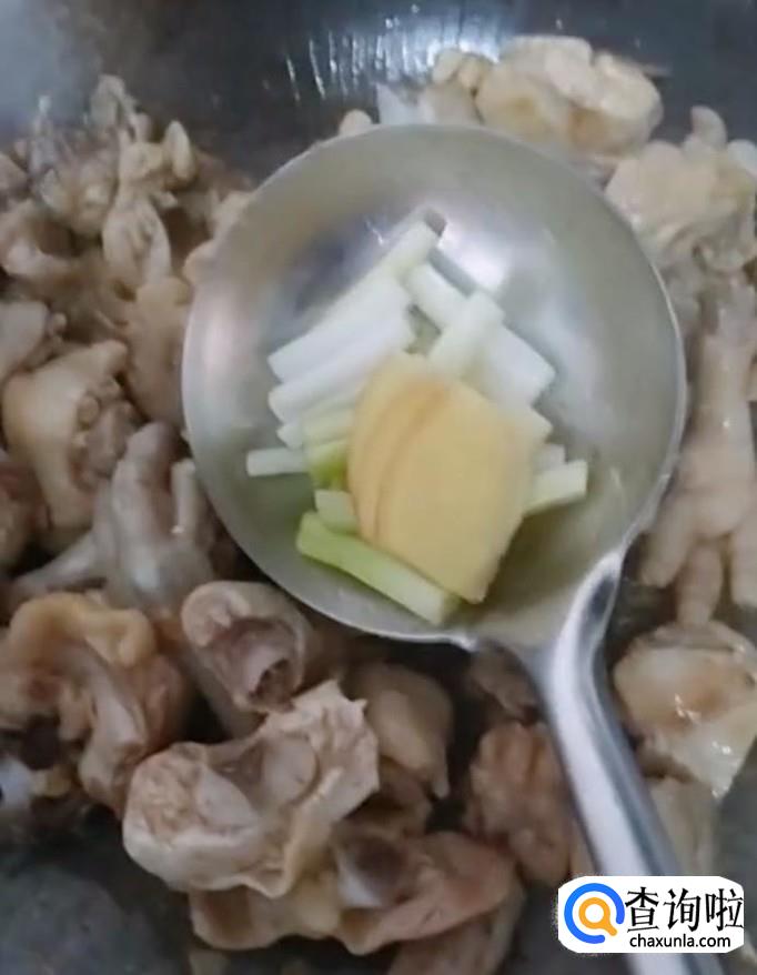 接着我们再倒入适量的清水,没过鸡块鸡块,烧开以后用勺子撇掉浮沫