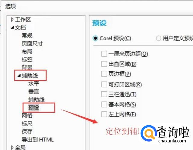 接着在弹出的选项界面中我们定位到辅助线下面的预设选项,如下图所示