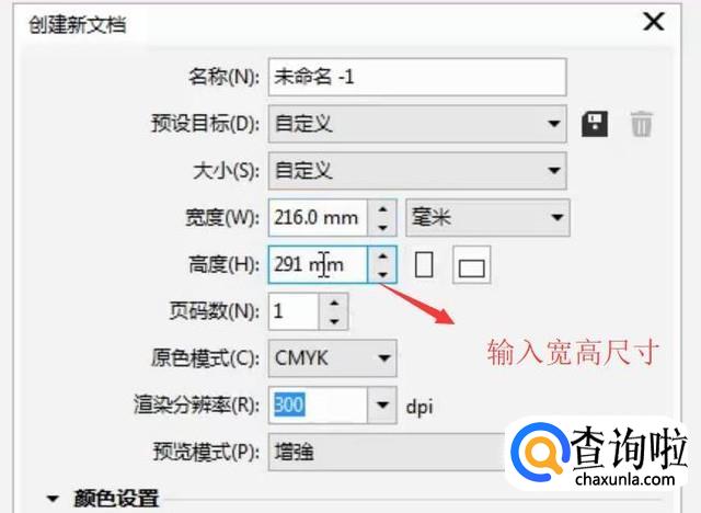 接下来在弹出的新建文档界面输入页面的宽和高,如下图所示